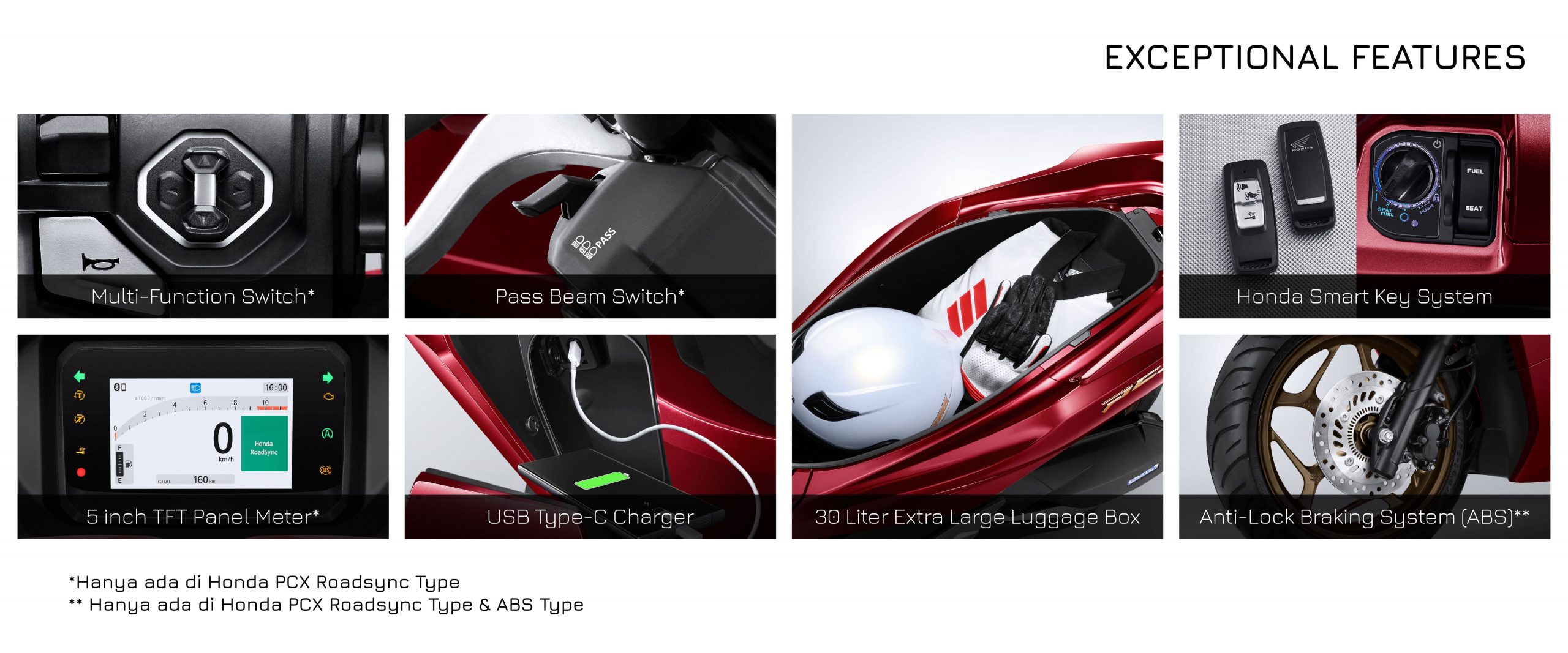 Honda PCX160 dilengkapi dengan berbagai fitur modern yang menjadikan setiap perjalanan lebih cerdas dan aman: